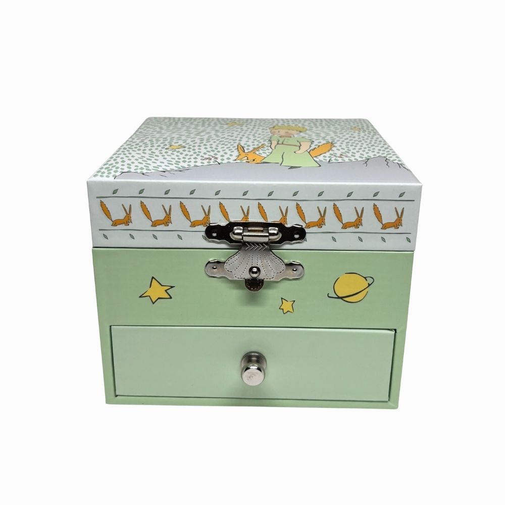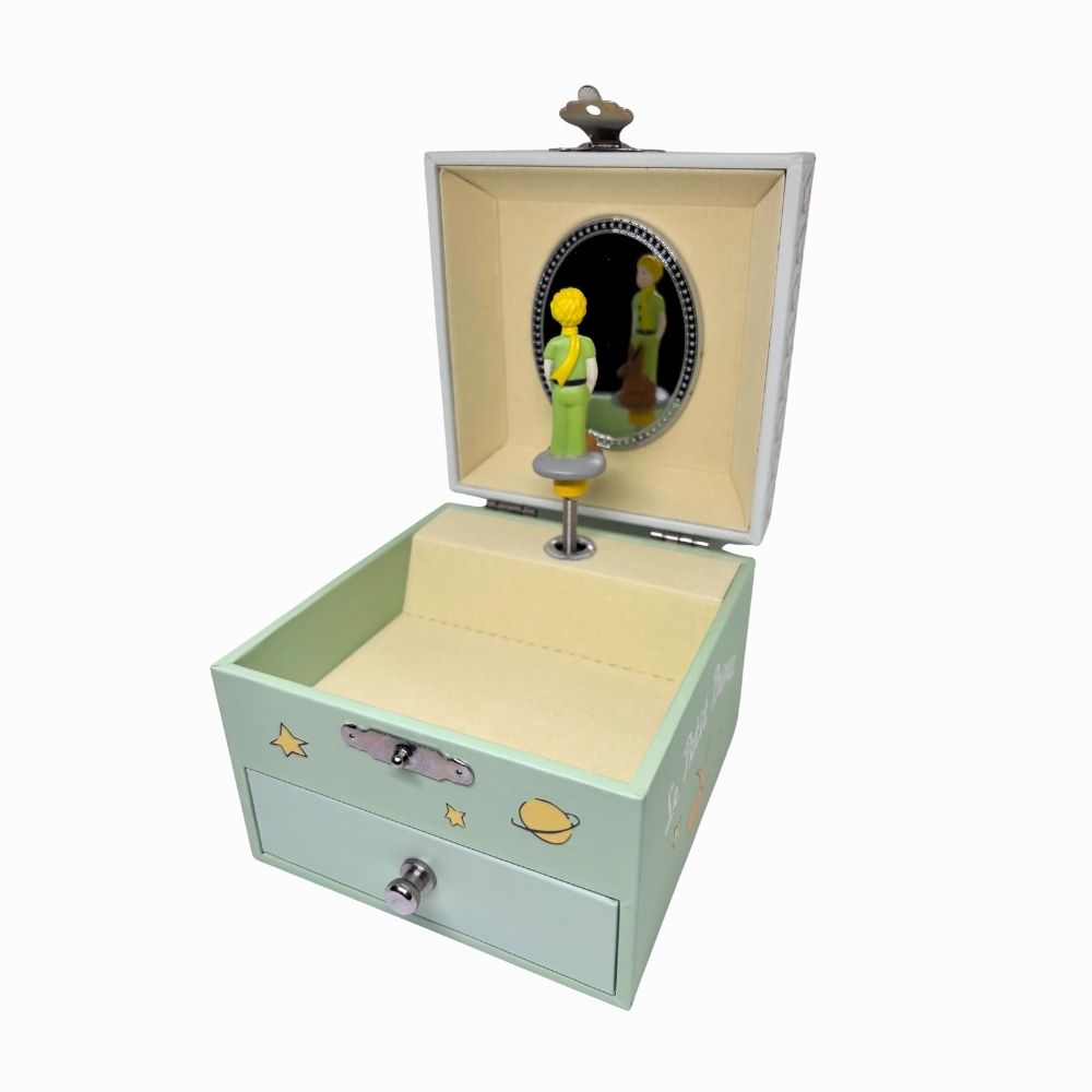 Discover this enchanting music box inspired by The Little Prince, a timeless classic that has captivated children for generations. Its delicate musical mechanism and gentle melodies create a magical atmosphere in your child's room. Perfect as a memorable gift, it stimulates imagination and a love of music from a very young age. Carefully crafted with details evocative of Saint-Exupéry's tale, this decorative object grows with the child and becomes a cherished family heirloom.